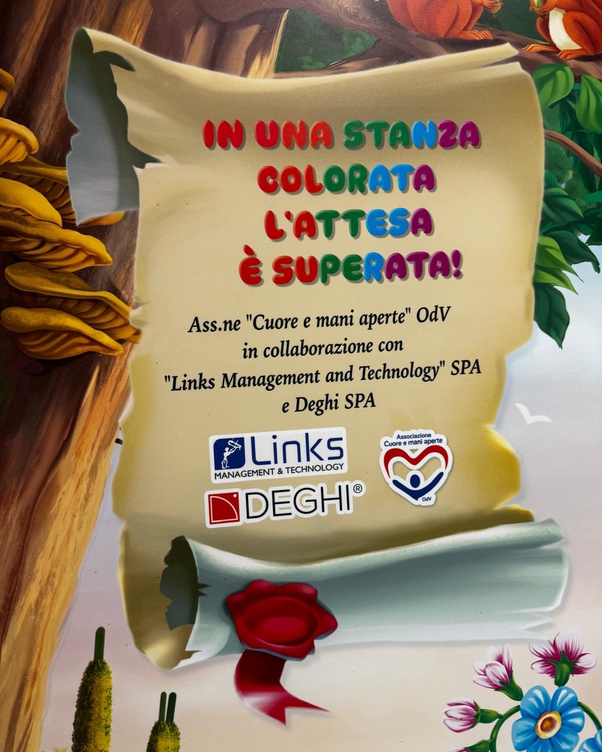Si è tenuta la cerimonia di consegna della umanizzazione pittorica della sala di attesa della Neuroradiologia del Fazzi. Grazie al nostro progetto Links per la Vita siamo felici di aver contribuito alla donazione realizzata dall’Associazione Cuore e Mani aperte OdV, in collaborazione con Deghi spa.