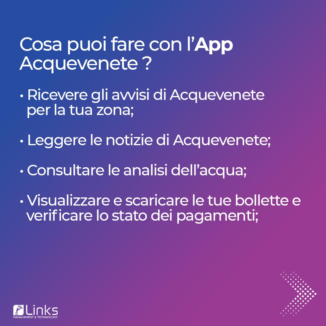 Acquevenete ha affidato a Links per altri 2 anni la gestione ed evoluzione del Portale Istituzionale, dello Sportello On Line (SOL) e dell’App. Sono state recentemente pubblicate le nuove versioni del SOL e dell’App mobile con evoluzioni e adeguamenti, tra cui l’identificazione tramite Spid e Cie, oltre a nuovi servizi digitali integrati con i sistemi di billing e CRM del Cliente.