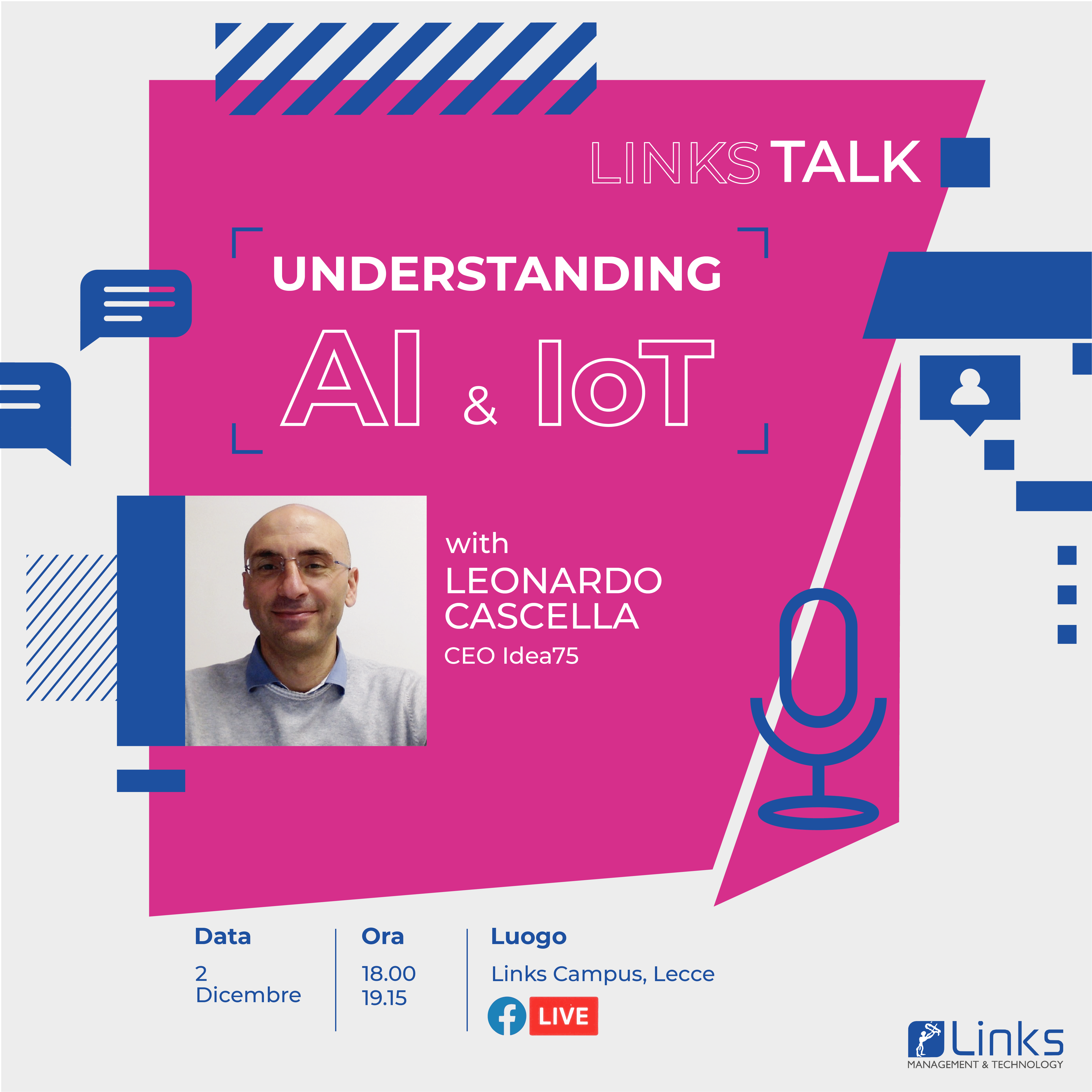 Leonardo Cascella chiarirà alcuni concetti chiave su AI & IoT anche attraverso casi di studio esemplificativi. L’evento prevede anche una Q&A session per un confronto aperto sulla tematica.